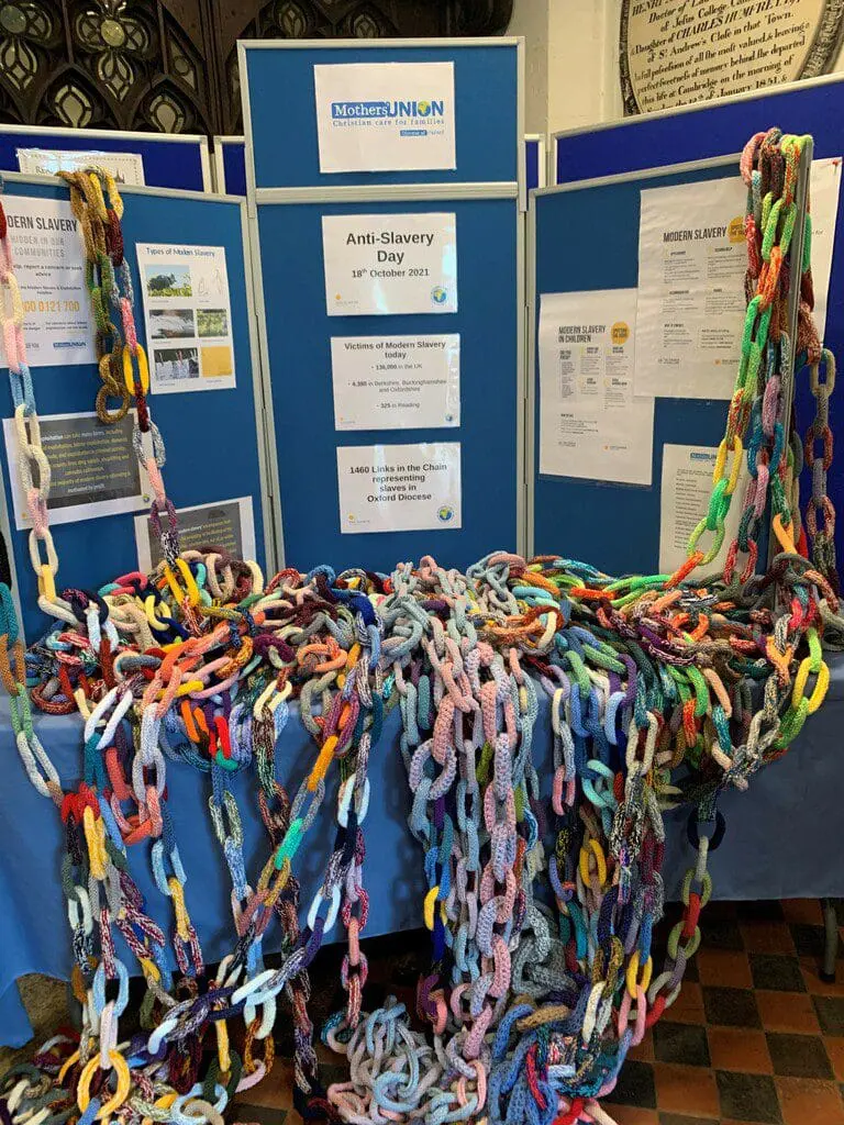Here is a photo from Jean Vaughan of more of the knitted chains which the MU produced locally as a way of illustrating the issue of Modern-day Slavery. There were 1516 links in the chain.