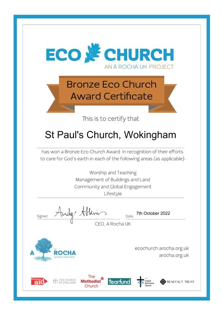 St Paul’s have been awarded a bronze certificate in recognition of the efforts we have made to care for God’s earth. A more detailed explanation of the ECO-Church project can be found here