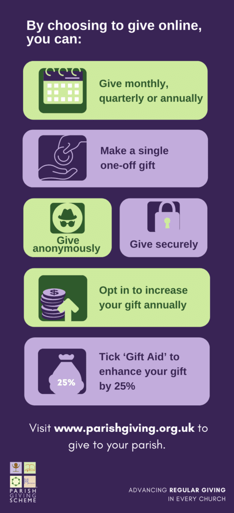 The Parish Giving Scheme is a new, free way to help you plan your giving and, if you are a taxpayer, to do so tax efficiently. Whether you currently give by Standing Order, the envelope scheme or by occasional donation, you can easily make the switch to this secure and efficient Direct Debit system.